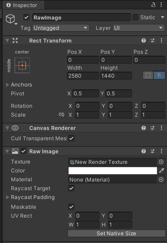 Raw image에서 크기 설정하고 밑 Raw Image 컴포넌트에 렌더러 텍스처 연결