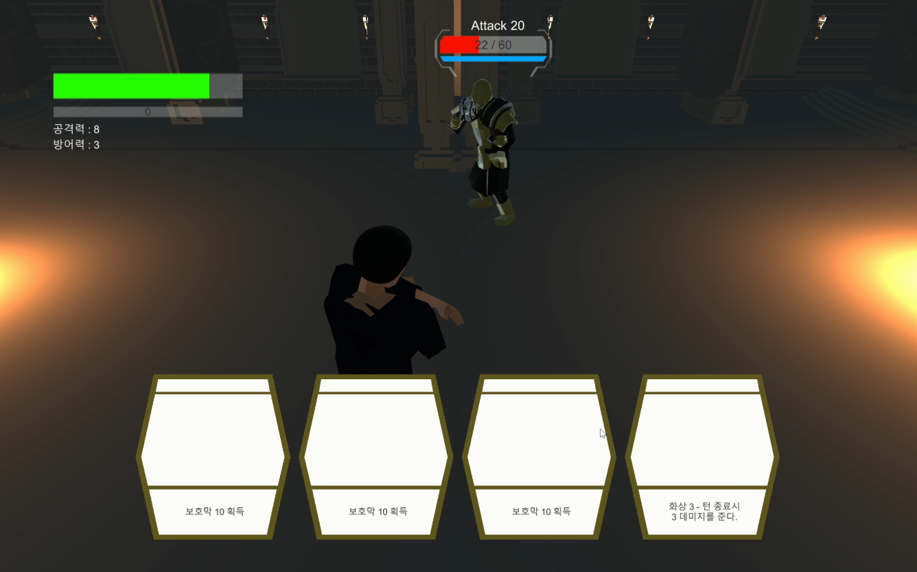 카드 덱은 기본 카드 8장에 전투 씬으로 들어갈 때마다 신규 유니크 카드가 랜덤하게 2장이 증가가 됩니다.